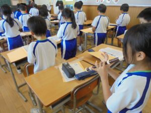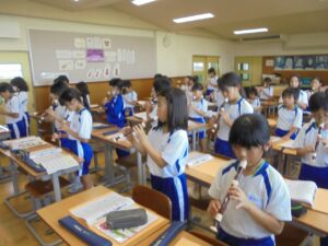 リコーダー演奏【3年生】 - Category - 3年日記 10月の学習発表会に向けて、音楽の授業ではリコーダーの演奏に取り組んでいます。指遣いに苦戦しながらも、みんなで息を合わせて頑張っています。きれいな「ソラシ」の音が音楽室に響いていました。これからもっとたくさんの音を吹けるようになりたいです!