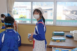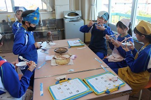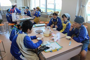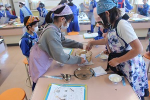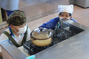 10月31日(金)に2組が、11月4日(火)には1組が、家庭科の調理実習で「ご飯炊き」を行いました。田植え体験・稲刈り体験でお世話になった農家の金川さんからいただいたお米を使い、米粒の色や大きさ、動きの様子を見たり、音を聞いたり、香りをかいだりして、お米の変化を観察しました。