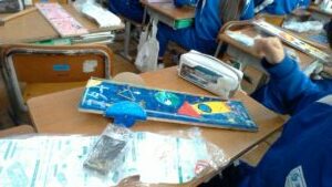 木の板に絵を描き、くぎと輪ゴムを使ってレーンを作っています。