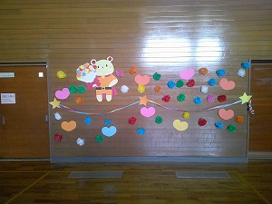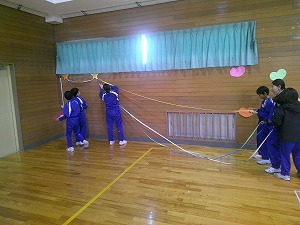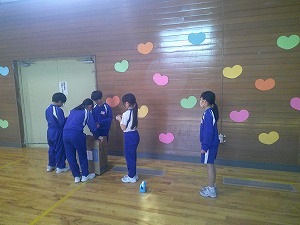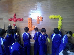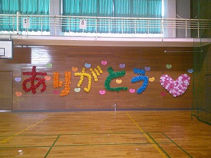 4年生は6年生を送る会に向けて、体育館の飾り付けを行いました。