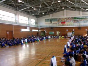 地区児童会の後、体育館に集まり「見守り隊紹介式」を行いました。